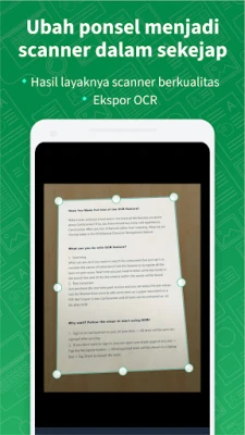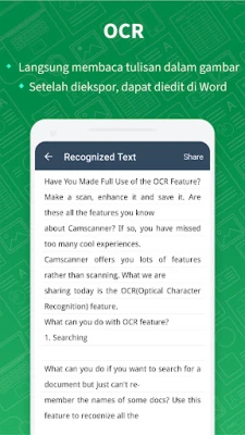 CamScanner menjamin setiap hasil pindai memiliki kualitas optimal. Teknologi pemotongan cerdas dan peningkatan visual memastikan teks serta grafik tampil jernih, tajam, dengan warna dan resolusi premium. Manfaatkan fitur OCR unggulan untuk mengekstrak teks dari gambar atau PDF, memungkinkan Anda menyalin, mengedit, atau membagikannya dengan cepat. Tidak hanya itu, berbagi dokumen dalam format PDF atau JPEG kini sangat praktis melalui media sosial, lampiran email, atau tautan langsung.